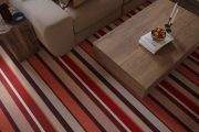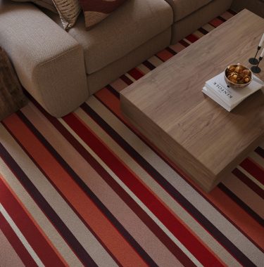 Step into a space filled with warmth and radiant energy with Audrey Sunbeam, where design and artistry converge to create flooring that transforms any room. The design features rich red and terracotta shades, softened with muted pinks and warm brown tones, while a crisp cream accent adds balance and contrast to the overall warm palette. Each stripe is carefully considered to catch the light, creating a sense of movement and depth underfoot.